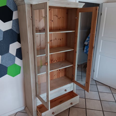 En sektion har vitrineskab med blyindfattede felter, røgfarvet glas.