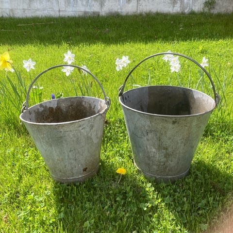 Zink dimser med sidehåndtag sælges samlet. Begge har løs bundindsats og bred åbning, gode til planter