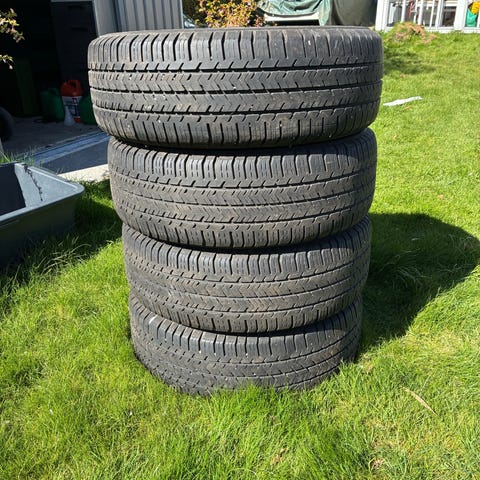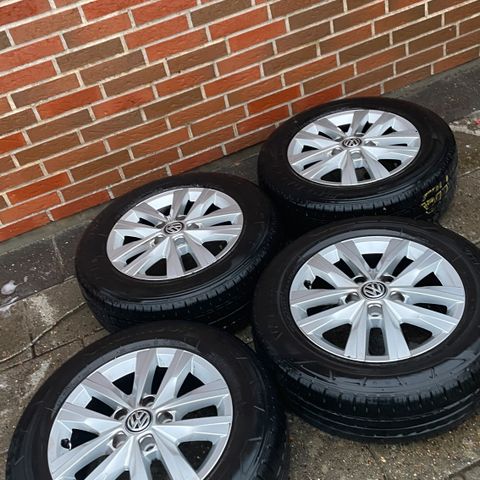 Sommerdæk på fælge, brugt en sæson til varevogn, har sidder Peugeot Partner van CA97485. Forstærkede til varevogn. Købt hos Quickpoint 2025.