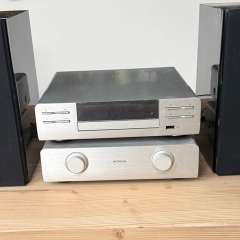 Denon stereosæt med kompakt forstærker og to matchende reolhøjttalere på 100w. Har flere tilslutninger bagpå til lydkilder og klassiske skrueklemmer til højttalerkabler.