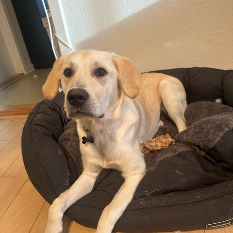 Mads har tidligere i sit liv været meget alene hjemme så dette kan nok læres i et nyt hjem. Hos mig har han været alene med vores andre hunde et par timer uden problemer.