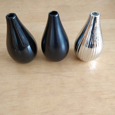 Et par fine minivaser designet af Just Andersen. Den ene har et bette tryk. Se billederne. De fremstår ellers i meget pæn stand dog med lidt alderssvarende patina og overflade brugsspor. Højde ca 5,5 cm. Kr 550,- pr stk. Begge for kr 1000,-