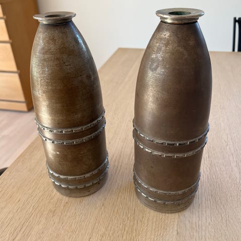 Stort gammelt granat-projektil på ca. 28cm Har tydelig spids top med indgraveringer og hul i siden.