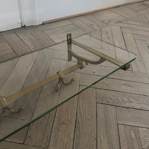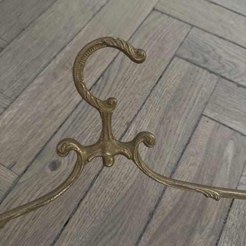 Midt på den smukt rillede/profilerede messingstang er der desuden 3 yderligere kroge til korte jakker og trøjer.