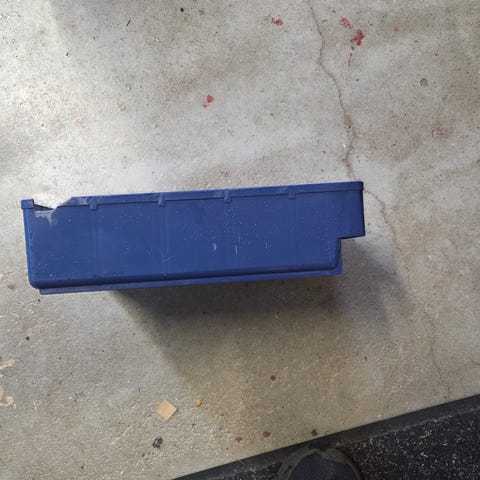 Solid indretningsudstyr til kassebil, flere skuffer og perforerede sider til ophæng. Har mange små røde plastkasser til sortering samt holder til skruestik i toppen.