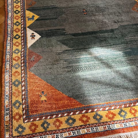 Flot retro ryatæppe fra Sverige -sandsynligvis håndknyttet omkring 1960. Det har et abstrakt og geometrisk mønster og er i røde, blå og gyldne farver. Sælges for 675 kr. Det er i fin stand uden pletter og måler ca. 96 x 165 cm. Kan ses på adressen eller sendes, men modtager betaler portoen.