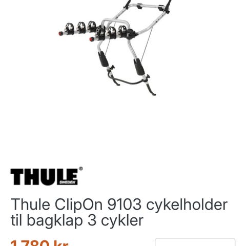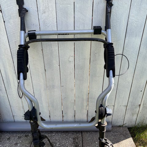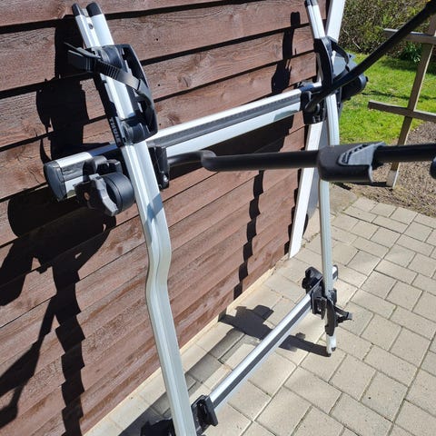 Thule ClipOn cykelholder til montering på bagklap, i sølvfarvet metal med sorte beslag. Har justerbare arme, remme og flere spænder til fastgørelse på bilen.