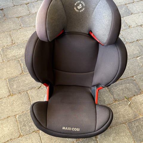 Maxi-Cosi Rodi autostol i sort med røde bælteføringer. Høj ryg og justerbar nakkestøtte, betræk i stof der kan tages af.
