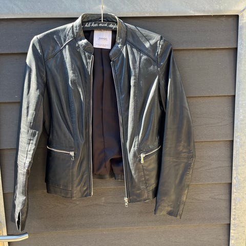Sort Mango læderjakke i str XS med asymmetrisk lynlås. Har to lynlåslommer foran og lynlåse ved ærmerne.