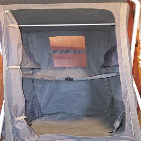 Out-Lust Pop up telt i grøn og grå med stor rund åbning i begge sider. . Har myggenet i åbningen og vindue med net i siden for luft.