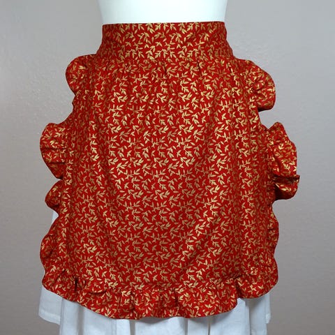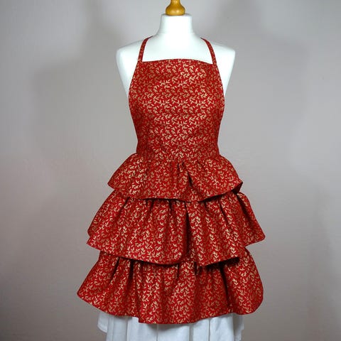Super sødt forklæde i ren retro-stil med masser af søde detaljer. Flæser overalt og lange bindebånd. Selve forklædet er lavet i en flot, klassisk julerød med guldprint. One size.
