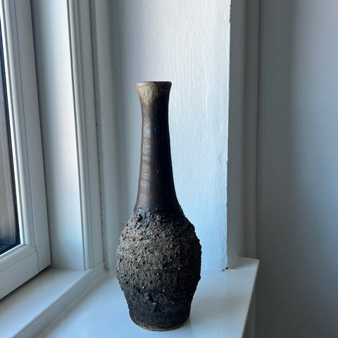 Flot cylinderformet vase med dots med blå glasur - signeret Ø, Denmark. H 22,5 cm, dia 5,5 cm.