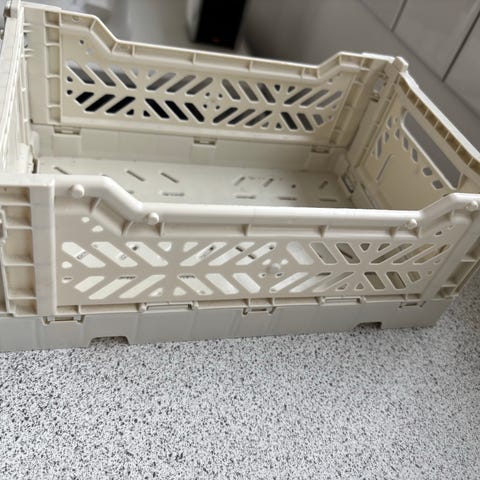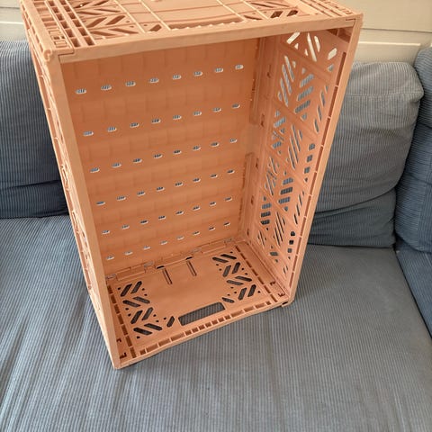 Grønne plast foldekasser fra Hay med udskårne sider og håndtag. Stables nemt oven på hinanden og kan foldes fladt sammen når de ikke er i brug.