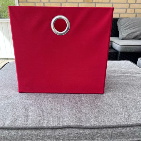 Blå firkantet opbevaringskasse med små kvadratiske huller i siderne. Har lys bund med rutemønster og er god til at samle ting i.