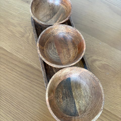 Perfekt til snacks, tapas, nødder eller toppings. De seks metalskåle kan tages op, hvilket gør både servering og rengøring nem.
