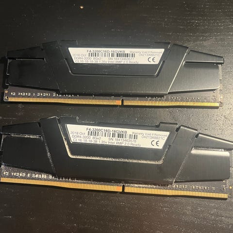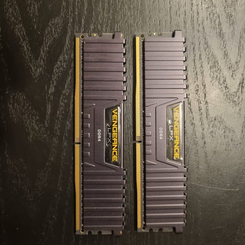 Corsair Vengeance LPX DDR4 RAM, 16GB fordelt på 2x8GB, 3200MHz. Har sorte heatsinks med lav profil, klar til standard desktop bundkort med DDR4.
