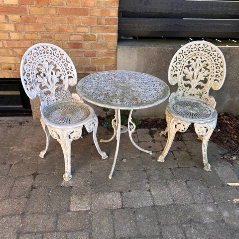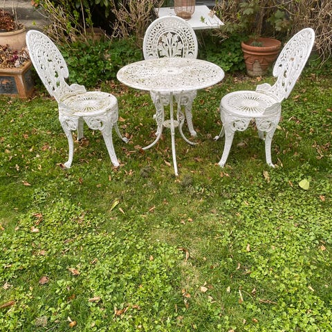 Dette havesæt i victoriansk stil er lavet af hvidmalet støbt aluminium og har klassiske, detaljerede mønstre på både bordpladen og ryglænene. Sættet består af et rundt bord og fire matchende stole, som er kendt for at være både lette og vejrbestandige sammenlignet med støbejern.