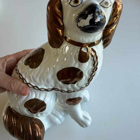 Retro kaminhund i porcelæn med smuk kobberglans fra cirka 50’erne.