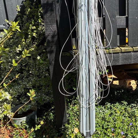 Paraply tørrestativ til haven med flere arme og masser af tørresnor. Kan klappes sammen, så det fylder mindre, når det ikke er i brug.
