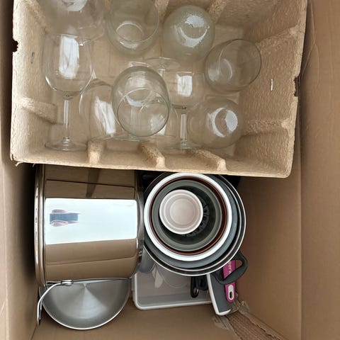 Kasse med diverse køkkenting (glas, skåle, gryder mv.). Skal hentes tæt på Bopa Plads. Oplagt til f.eks. den studerende, der skal flytte hjemmefra. Bemærk! Jeg har to kasser med forskelligt indhold