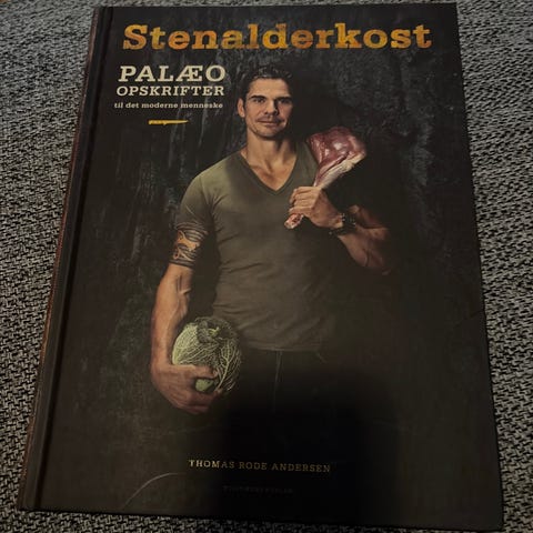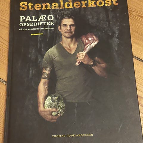 Kogebogen "Stenalderkost – Palæo opskrifter" med masser af opskrifter på hovedretter, mindre retter, tilbehør og salater. Stor hardbackbog med overskueligt indholdsregister og mange sider med opskrifter.