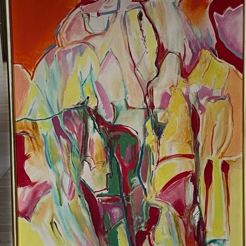 Stort abstrakt maleri af Ib Høygreen i kraftige røde og orange nuancer med lidt grøn og gul. Opspændt på lærred med ramme omkring, klar til at hænge op på væggen. Måler 103 x 83 cm