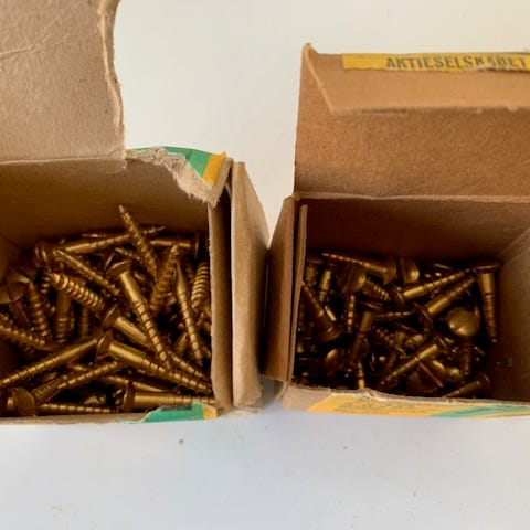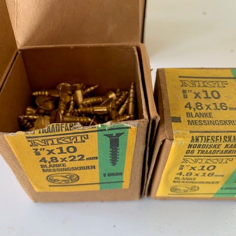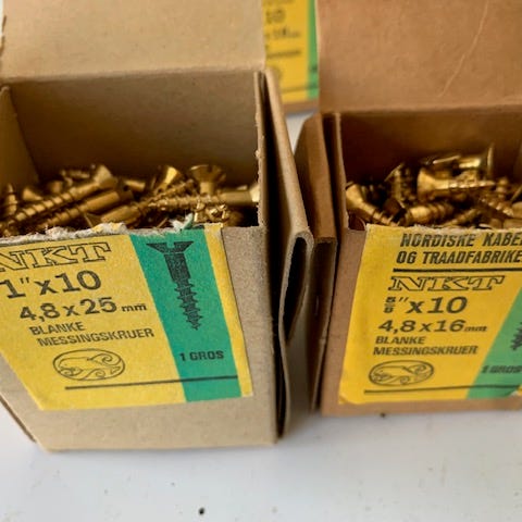 2 pakker 5,5x19 mm. NKT blanke messingskruer, undersænket, lige kærv. 1 gros (144 stk) i pakken. Den ene er knap 50% fyldt. Nypris 450 kr pr. Pakke + 225 kr for en halv pakke, i alt 675 kr. Køb til næsten 1/3 af prisen.