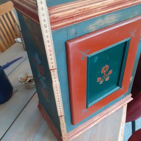 Gammelt vægskab med bemaling, Højde 0.63, Brede 0.49, dybde 0.20