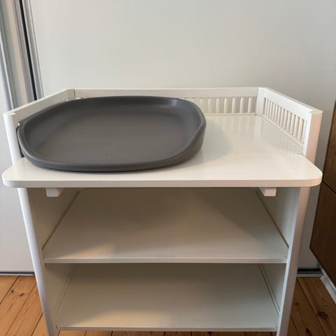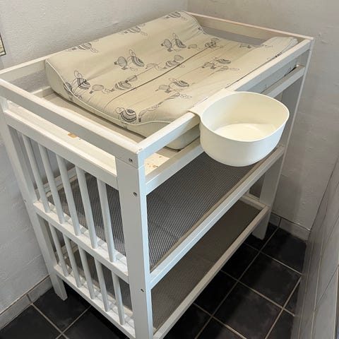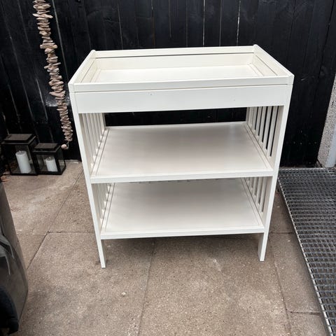 IKEA puslebord i hvid med høje kanter rundt om puslepladsen. Har to åbne hylder under til opbevaring af bleer, tøj og andet udstyr.