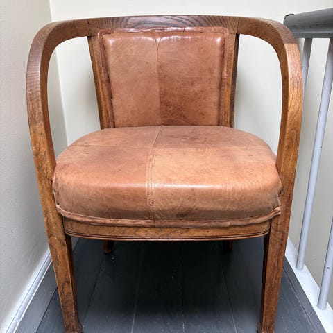Armstol/kontorstol/Herreværelse/Skrivebordsstol/Biblioteksstol med stel af massivt egetræ,betrukket med sømbeslået Cognac farvet læder.