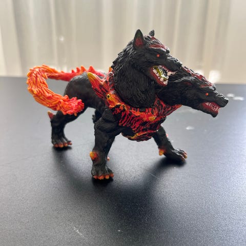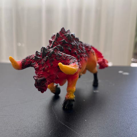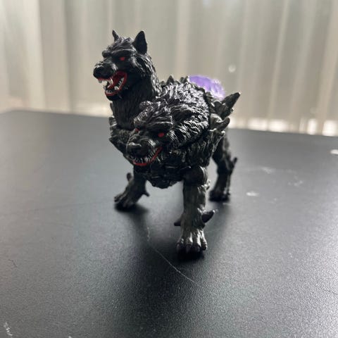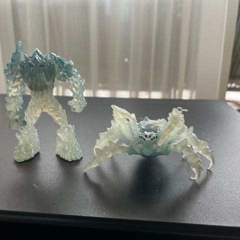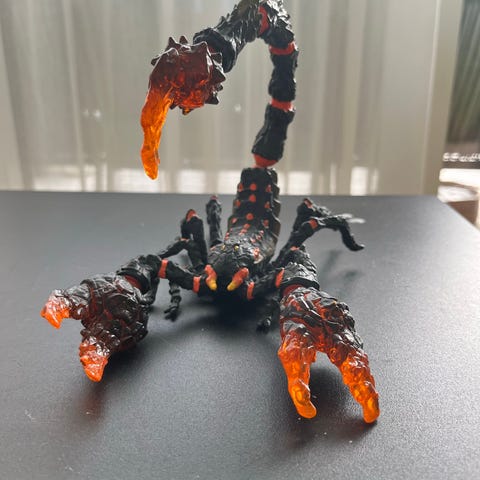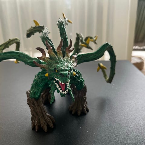 Figur af en stor edderkop i grøn og gul med flere ben og tydelige hugtænder. Fin som legetøj eller pynt til dem der kan lide lidt uhyggelige figurer.