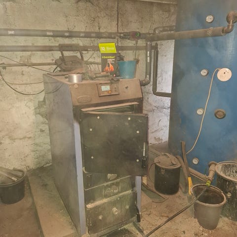 Velfungerende Blackstar Træpillefyr med snegl, ekspansionsbeholder og pillebeholder.