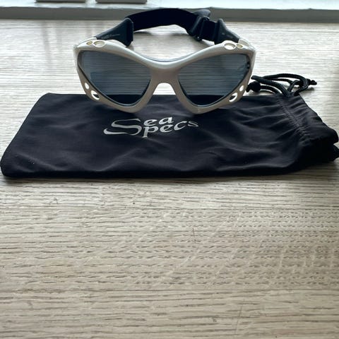 Prada unisex solbriller med klart, mat stel og buede stænger. Leveres i blødt mørkeblåt etui med snøre.