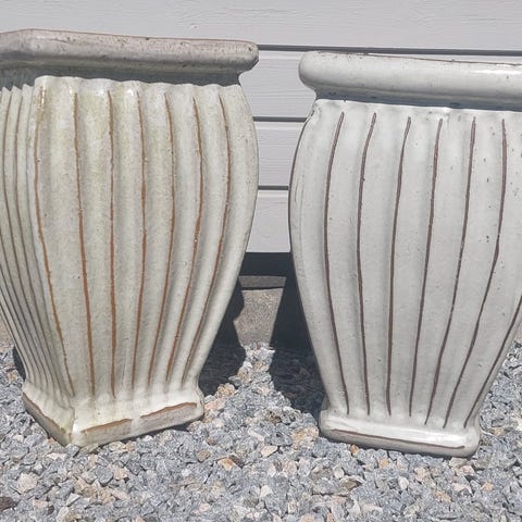To blomsterkummer i beton med synligt ral udvendig - se billeder hvis det ikke giver mening.