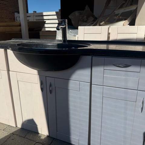Hvid IKEA badeværelsesvask med integreret vask og to store skuffer. Har udskæring til armatur og afløb samt glatte fronter, der er nemme at tørre af. Har stået i vores sommerhus, så ikke brugt meget.