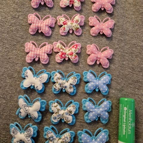 En pose Hæklede blomster i foreskellige størrelser & sommerfugle.