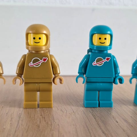 LEGO røde rum-minifigurer med hjelm og iltflaske sælges samlet. Alle har det klassiske rumlogo på brystet.