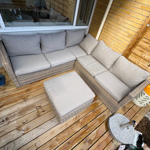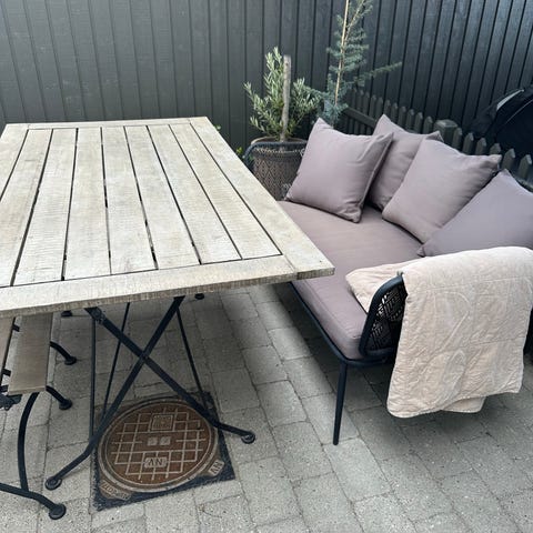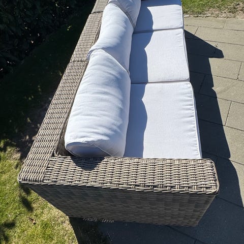 Hyggelig loungesofa i flet til haven/terrassen med lyse hynder. Der følger også en lille matchende fletskammel med. Hynderne har været opbevaret indet, de har enkelte små brandmærker på den ene side fra et bål, men fungere fint og er som på billedet.