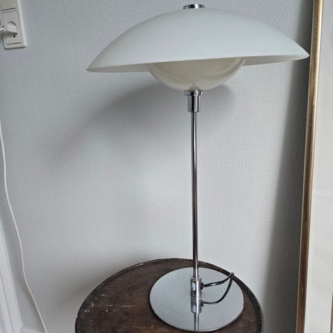 Fin hvid bordlampe med buet kromarm og rund fod. Giver et godt arbejdslys på skrivebord eller sidebord.