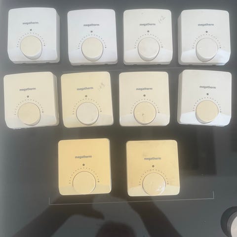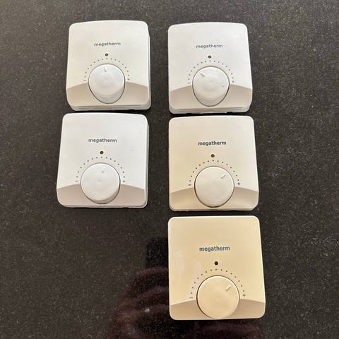 4 stk. Megatherm rumtermostater med stort display og frontknapper til styring. Bagsiden har skrueklemmer til tilslutning og kan monteres direkte på væggen.