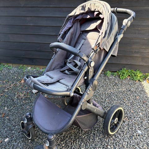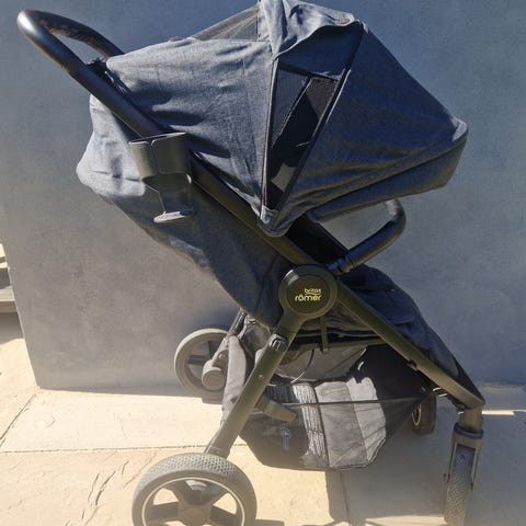 Britax klapvogn i mørkegrå med stor kaleche og justerbart sæde som kan lægges helt ned. Har varekurv under vognen og håndtag med læder. Fungerer upåklageligt, er aldrig brugt. Pletten på billedet er fra en våd klud. Kan hentes på Vesterbro.