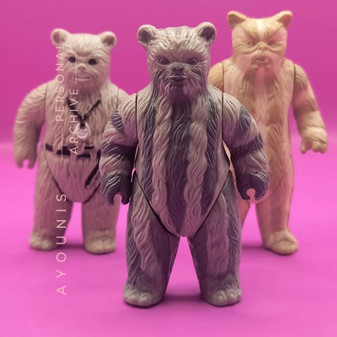 ▰▰▱▱▱ [ AYOUNIS | GOOD / USED ] Som del af et professionelt forvaltet arkiv er genstandene opbevaret røg- og støvfrit. Sættet fremstår i en autentisk brugt stand med synlige brugsspor. Der observeres malingsslid på tværs af figurerne, især på hænder og ansigtstræk. Squid Head og Bib Fortuna mangler deres respektive tekstilkapper og tilbehør. Ansigtsdetaljerne er dog stadig tydelige, og stemplerne på bagsiden er verificerede. Disse brugsspor vidner om genstandenes historie som ægte vintage-objekter fra 80'erne. Se venligst billederne for en fuld æstetisk vurdering.