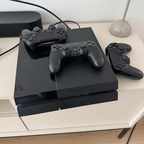 PlayStation 4 konsol fra Sony i sort. Har to trådløse controllere og kabler vist på billedet.