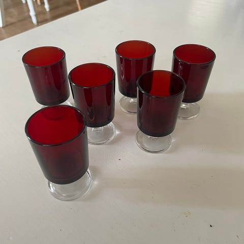 Seks røde franske Luminarc glas på klar fod sælges samlet. De er gode som små vand- eller vinglas og har en enkel, rund form.