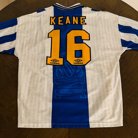 Blå/sort mønstret trøje med gule detaljer, TeamViewer sponsor og Kohler på ærmet. En af de mere unikke 3. trøjer fra United i nyere tid.
