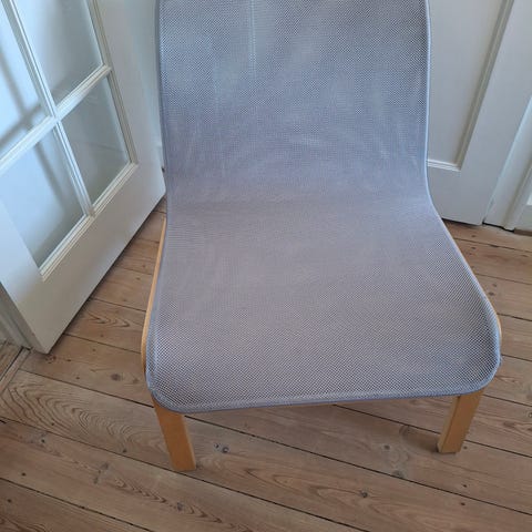 Blå loungestol med blødt polstret sæde og ryglæn. Har sorte ben og et enkelt, rundt design der er nemt at placere i rummet.