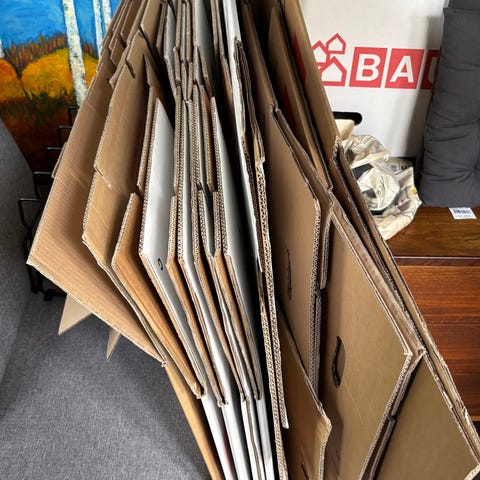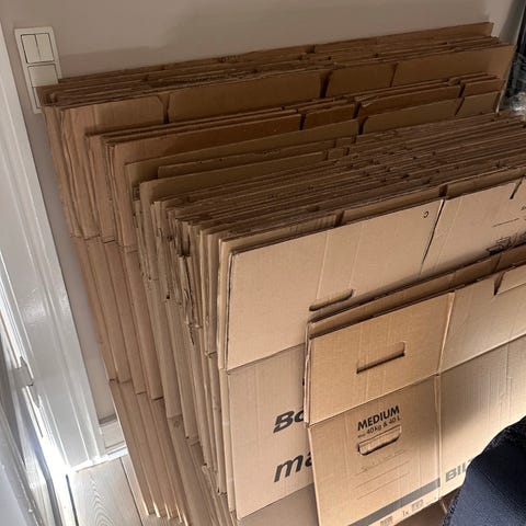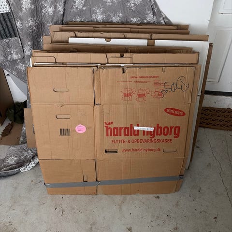 Bauhaus flyttekasser af typen SENIOR med bærehuller i siderne. Kasserne er mærket med max 20 kg og har tryk til indhold og rum på siden.