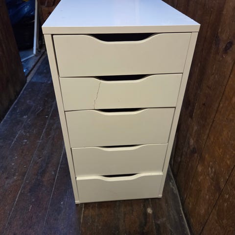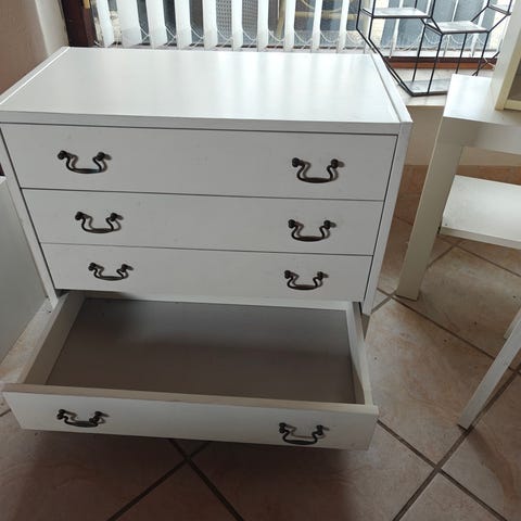 Hvid kommode med tre skuffer og håndtag . Fin som ekstra opbevaring i fx bryggers, værelse eller kontor.