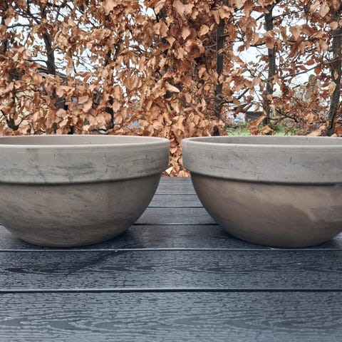 2 stor terracotta krukker med blomstermønster sælges. De står på en matchende underskål og er fin til terrasse eller indgangsparti. Prisen er samlet for begge krukker.