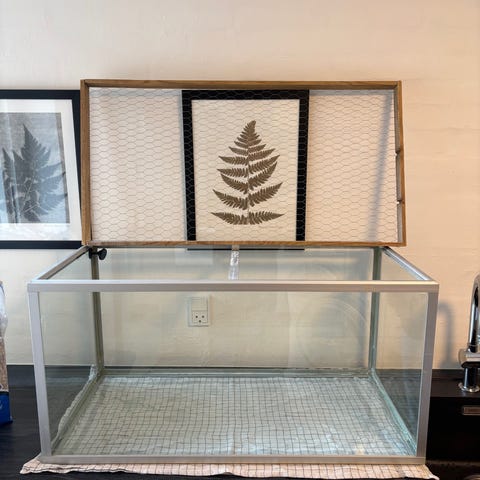 Fint hamster bur med glasbund og sort tremmetop, hvor der er flere træhylder og ramper indeni. Der er også løbehjul, små huse, mad skåle, drikkedunk og legetøj, og der er godt med plads til at indrette til dyret.